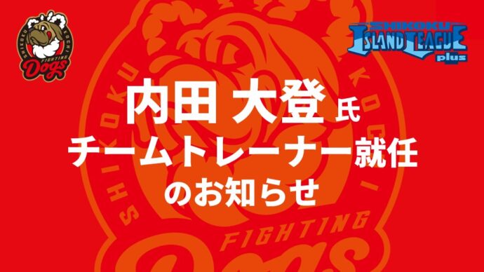 高知ファイティングドッグス球団では、2026年シーズンのチームトレーナーに内田大登氏の就任が決まりましたので、お知らせいたします。