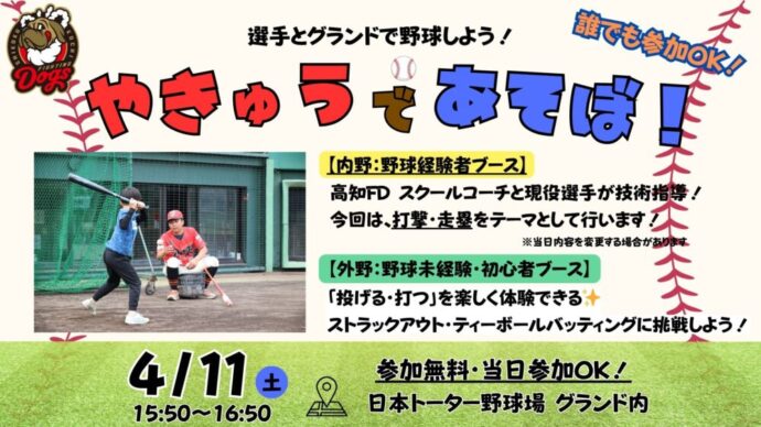 高知ファイティングドッグスでは、「2026 四国アイランドリーグplus公式戦」 ホーム開幕戦にて、試合前に野球イベント「やきゅうであそぼ!」を開催いたしますので、お知らせいたします。