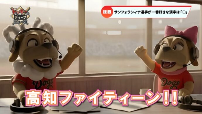 そこで今年は、高知ファイティングドッグスのデジタルマーケティングパートナーである「株式会社Hakuhodo DY ONE」様、アニメーション拡張スタジオ「株式会社ZETTAI WORKS」様ご協力の元、AI技術を使った「ドッキー」のアニメ化へ挑戦し、IP×テクノロジーで高知のスポーツ産業をさらに進化させて参ります。