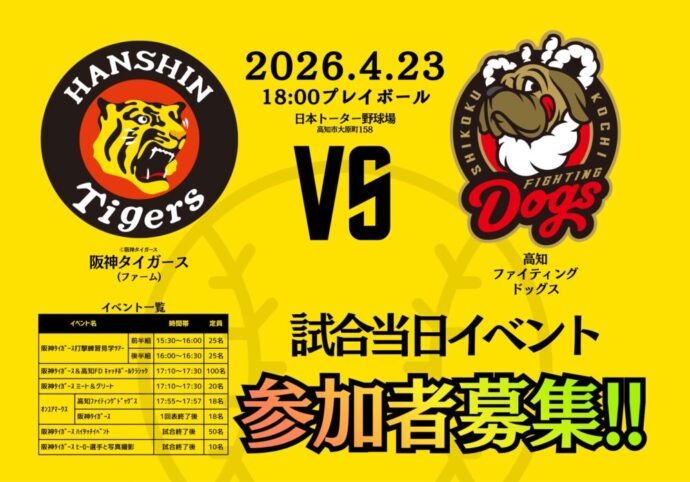 2026年4月23日阪神タイガース(ファーム)との交流試合のお客様参加型イベント情報をお知らせいたします。 【事前申込】 阪神タイガース 打撃練習見学ツアー 試合前のバッティング練習をグランドから見学しよ…