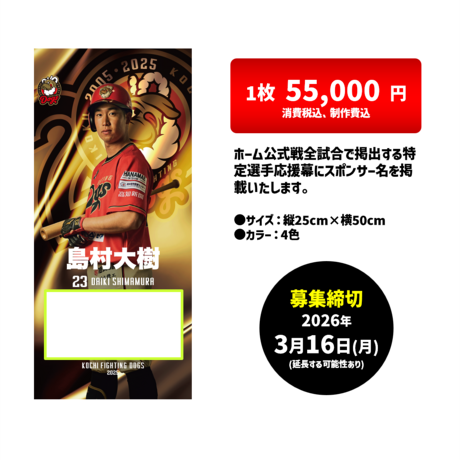 ホーム公式戦全試合で掲出する選手応援幕にスポンサー名を掲載いたします。